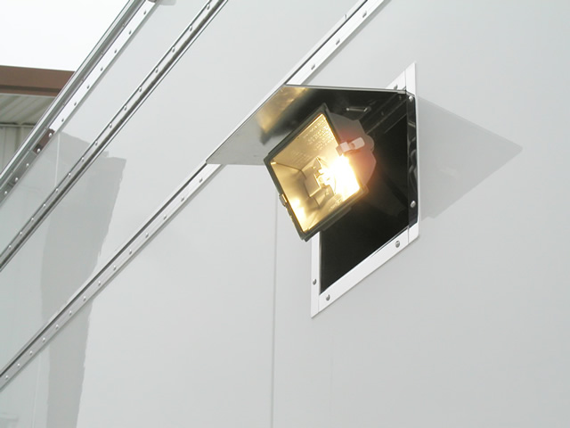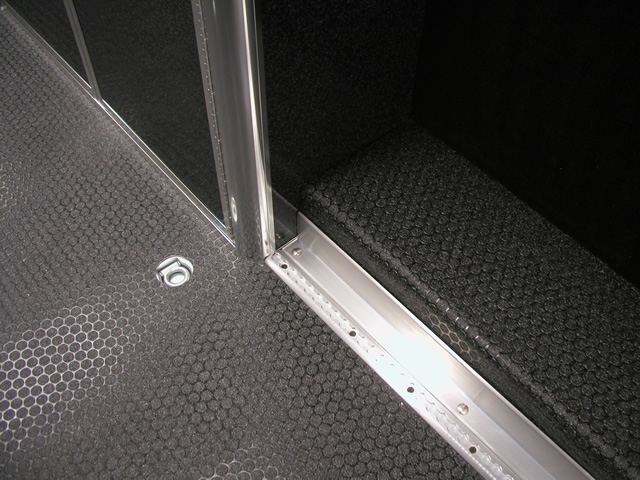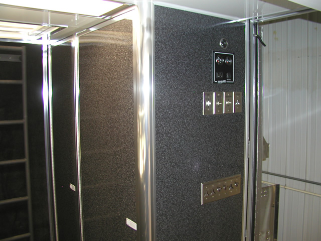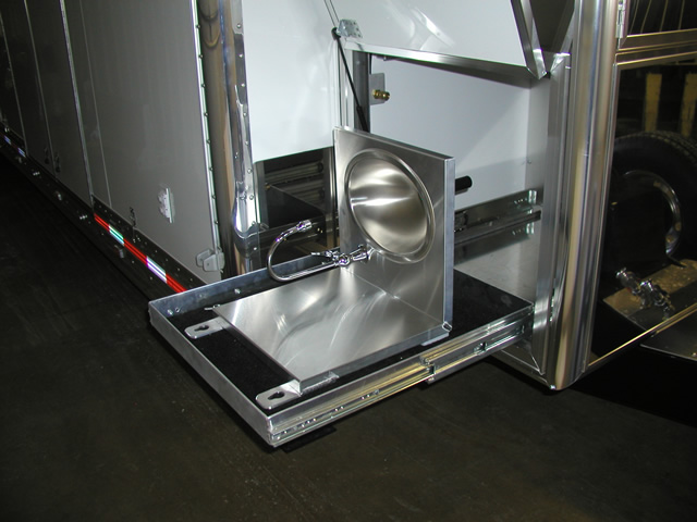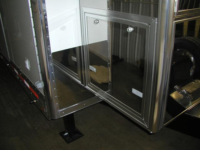 John and Pam's Pro Style 40' T&E All Aluminum trailer features a heavy duty suspension system utilizing Watson Chalin axles and a custom built T&E 5th wheel tongue which allows them to pull the trailer behind their custom totorhome. The custom built T&E rear lift gate allows them to put one of their cars in the attic level of the trailer and to load their other race car below in the lower storage area. The trailer also features a fully polished set of extrusions as well as a polished stainless sheeted front box unit that holds a large generator unit, air compressor and a/c unit. The pit side of the trailer has a row of power solenoid actuated quartz lights with flush doors that provide for excellent lighting during late evening race sessions.