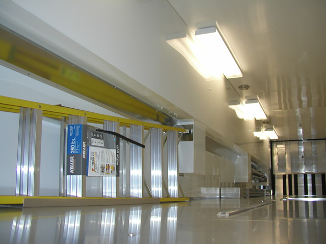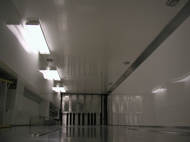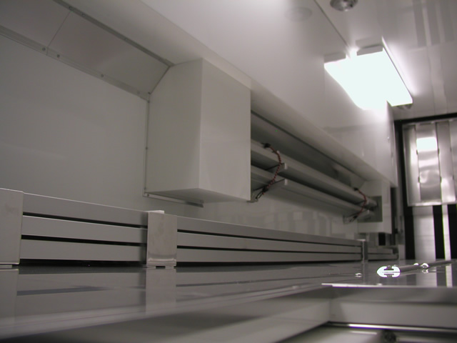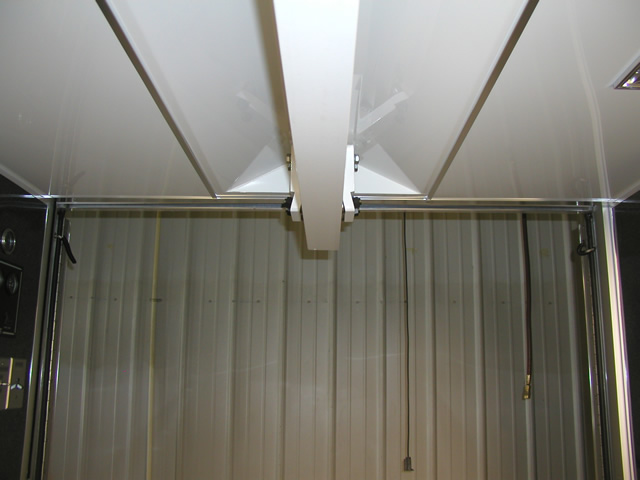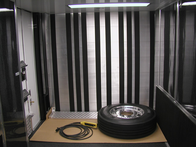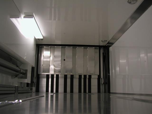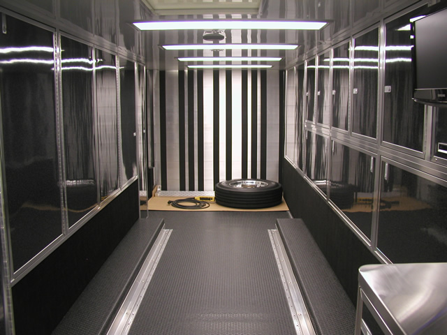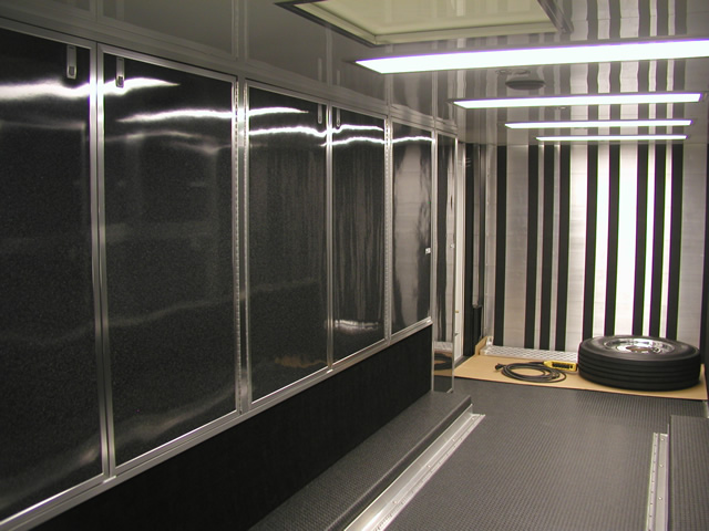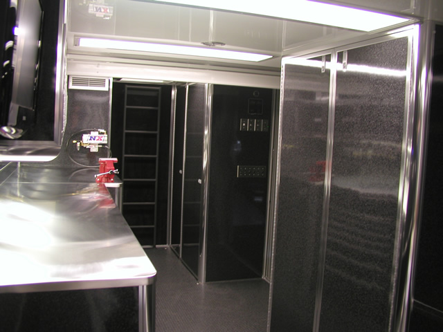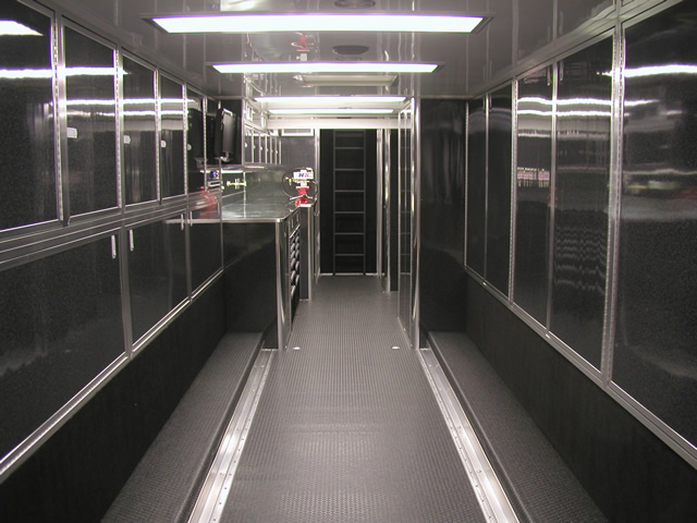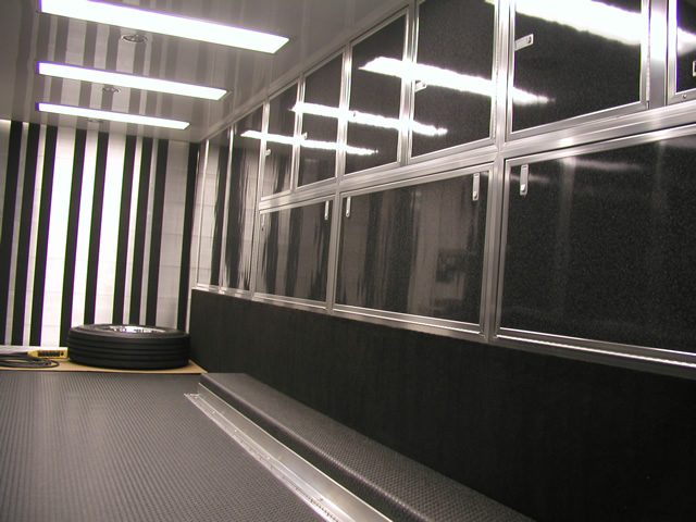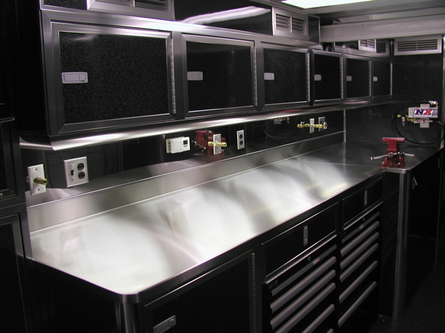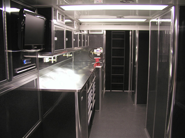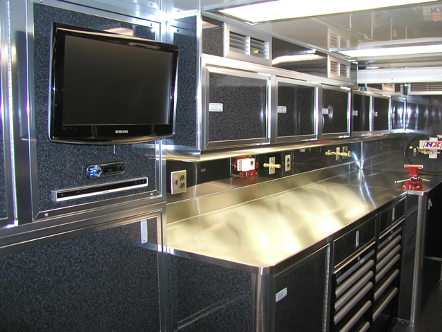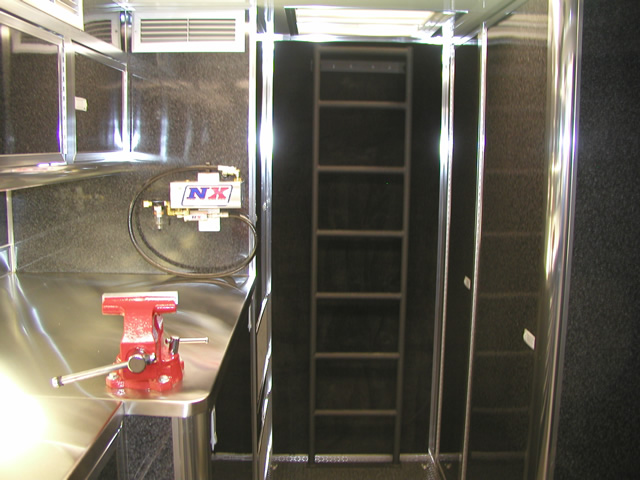 For entertainment (and for watching race video) the is an entertainment center which holds an LCD TV, DVD Player and Stereo system. Just to the rear of the entertainment center is a bank of storage cabinets that feature fold down doors with stainless sheeted tops. These serve as work surfaces and also allow John an area to hook up a laptop. The entire interior of the trailer also features excellent lighting which is located both on the ceiling as well as under cabinet lighting over the work bench. Upstairs in the attic level there are slick mounts and also ladder mounts, pit table mounts and an awning pole rack. Please take a look at the photo's below to see all these features as well as the numerous ones not mentioned.
