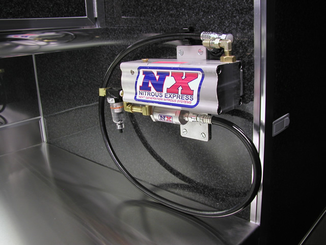 The main entry and rear manway doors of the trailer feature custom built T&E polished aluminum door trays and tool box holder. The interior work area of the trailer has lots of custom built cabinetry covered in special laminate that John and Pam personally picked out. There are cabinets to hold all their race parts and accessories along with a Nitrous Bottle Filling Station at the front of the work bench. There is also a portable overhead interior engine changing beam to allow for easy access to spare transmissions, engine assemblies and other heavy items through the main side entry door. Just forward of the main entry door there is a full height cabinet which has specially fabricated T&E Aluminum sliding shelving that allows easy access to parts and to the rear of the main door is a large cabinet with sliding shelves that holds their spare transmissions. Lista cabinets located in the main work bench provide storage for John's tools and other smaller parts. In addition, fuel jug racks are located in cabinets located over the fenderwell of the trailer.