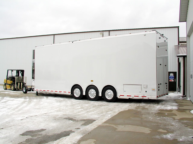 T&E Auto Haulers custom built a 40' All Aluminum Top Sportsman Trailer for John Benoit. John and his wife Pam own and operate Benoit Electric, Inc. located in Barre, Vermont and are active in the NHRA Top Sportsman Class. The Benoit's put a lot of thought into exactly how they wanted their trailer built and the result is perfectly matched to their needs.
