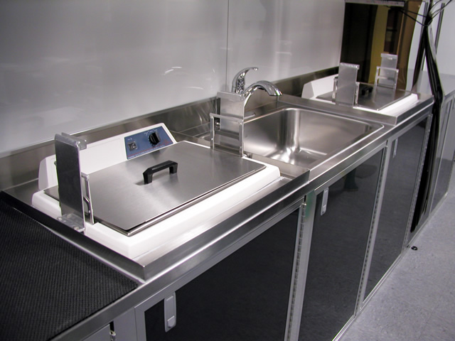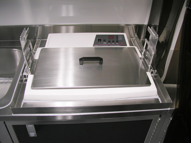 The rear portion of the trailer is a fully equipped surgical instrument repair shop which houses all the specialty tools and equipment that Brent needs to perform his daily work. The fully climate controlled work area also features a JET air filtration system to filter contaminants from the air. Under the main work bench T&E custom built a high powered vacuum system with suction tubes running up to each tool to ensure that debris from the tool restoration processes is contained properly. To make the long days at work more enjoyable, there is a high powered multi-speaker stereo system installed within one of the benches in the work area.